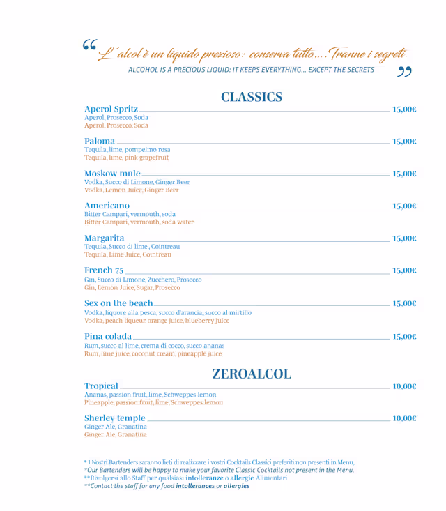 The only thing positive about our experience was the beautiful setting. We went at sunset and it’s out on the water. The service was slow and it was probably the worst food I have had in Italy yet. Seabass was bland, “potatoes” were unrecognizable mush and cabbage was way over salted.
