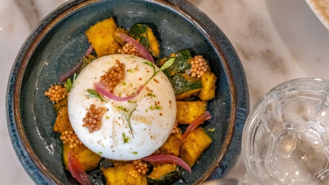 Straciatella, vinaigrette de kalamansi, fleurs de tagètes et basilic thaï