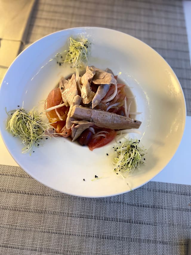 4.5/10No one greeted us when we arrived, so we just sat down. Waited 3-5 min and then got menus, that were diffrent from their online menus. Waited 30 min before the waiter came back... Starters were ok, but my wife had a salad as a main (with no dressing..just tomatoes, tuna and a coarsely chopped onion) and I had an entrecote that was ordered as medium rare, but came as 'done'. Sent it back to the kitchen - and got a steak back that was cold and raw in the center... Desserts were nice. We won't be back