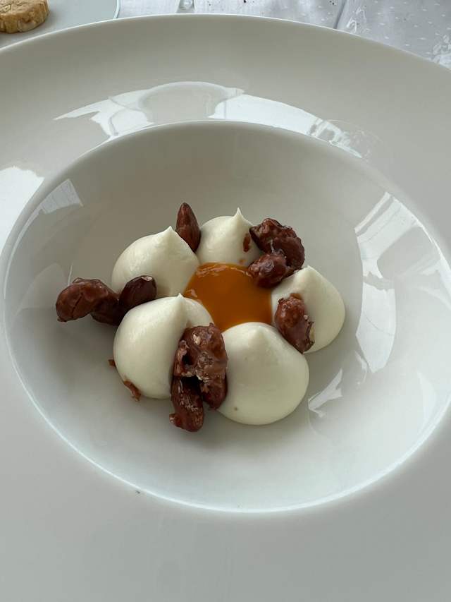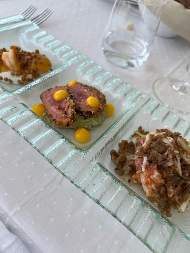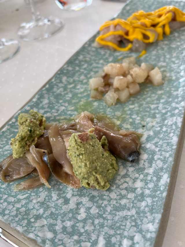Capasanta gratinata con crema di castagne*/ involtino di verza con baccalà olive, pinoli, uvetta in salsa della tradizione vastese / mazzancolle scottate con vellutata di zucca e i suoi semi
