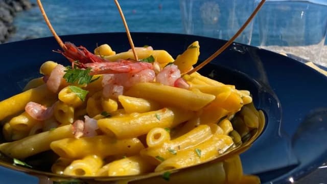 Pasta di semola di grano duro (penne), pesce spada, melanzane, pomodorini, aglio, prezzemolo, olio evo, pinoli.
