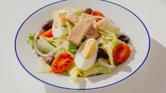Uova, pomodorini, olive nere, tonno e cipolla rossa servita con pane pita