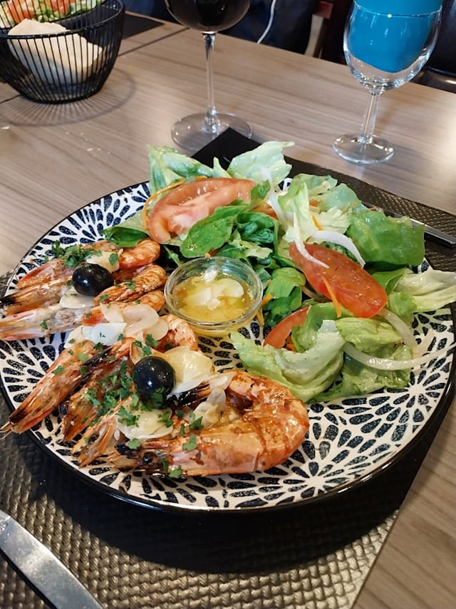 Gambas, frites et salade