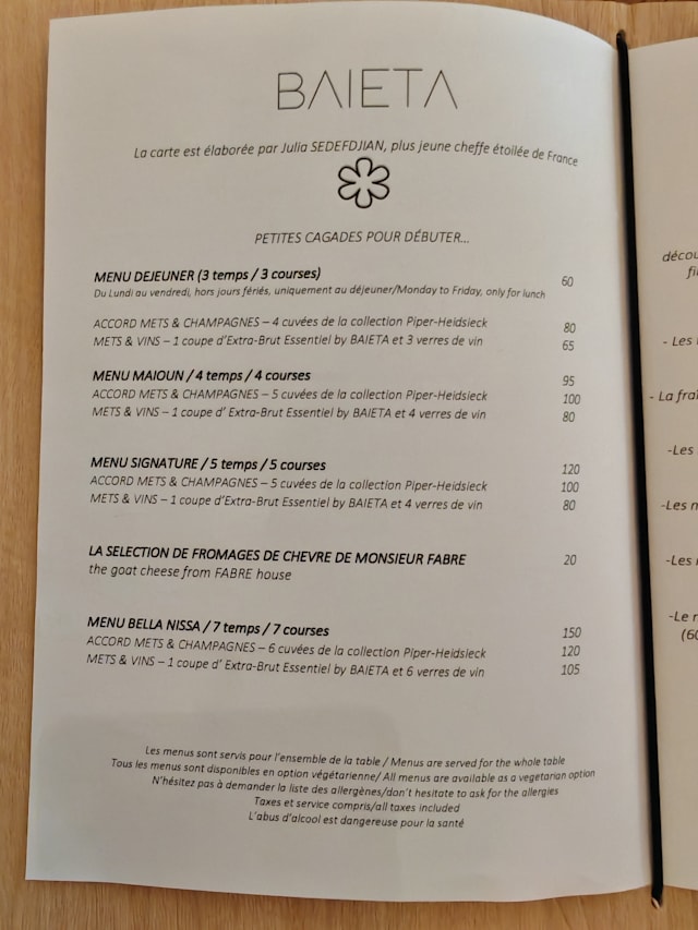 10/10I was in Paris alone and wanted a beautiful dining experience. Baieta delivered on food, wine and service at a very reasonable price.
