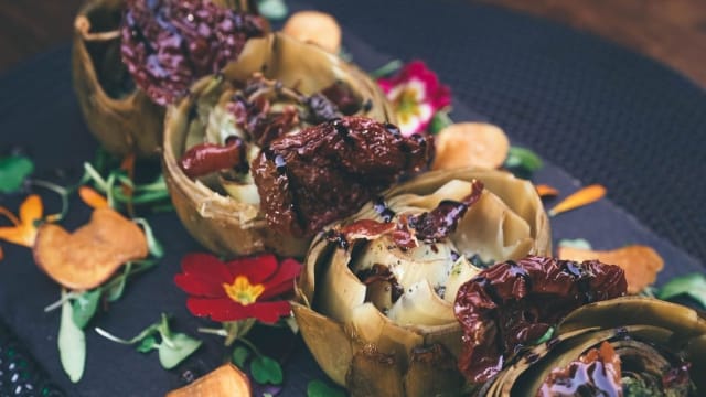 Colchón de verduras, tomates secos, pedro ximenes y burrata bañada al pesto