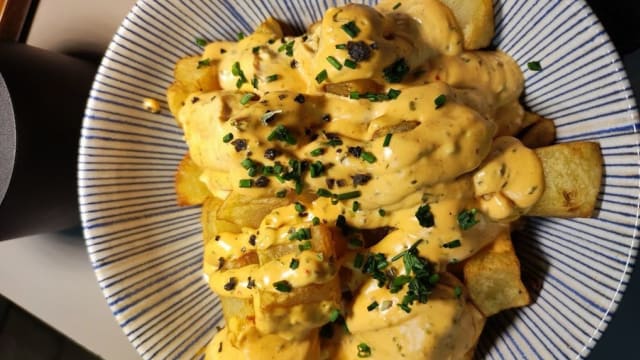 Patatas, queso cheddar, bacon y cebolla crujiente.