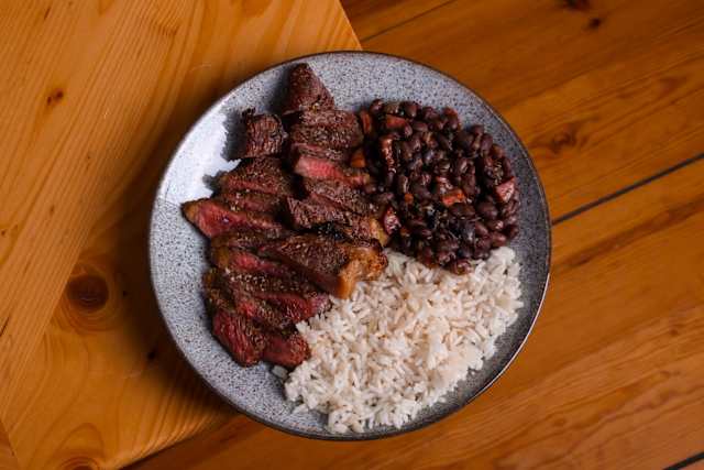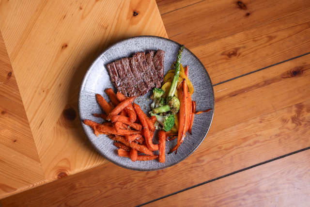 - T-bone acompanhado por batata doce frita e uma salada de tomate cherry, pepino e cebola.