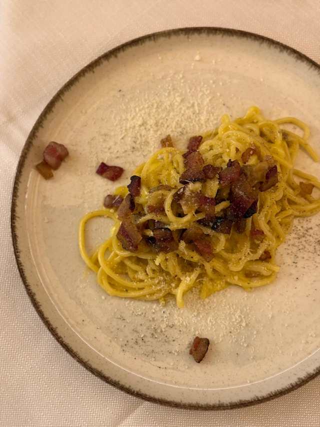 - Con cipolla di tropea leggermente affumicata, polvere di olive e datterino giallo confit