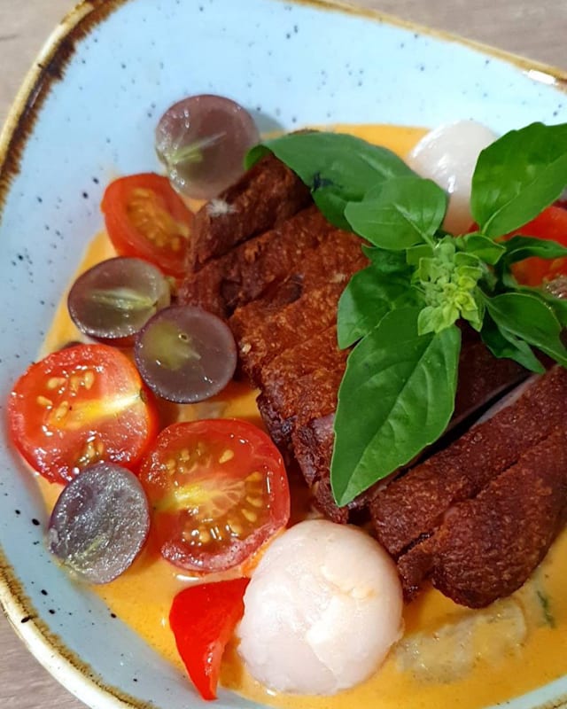 Pato al curry rojo, picante, con piña, tomate,uva y lychee para suavizar el sabor.