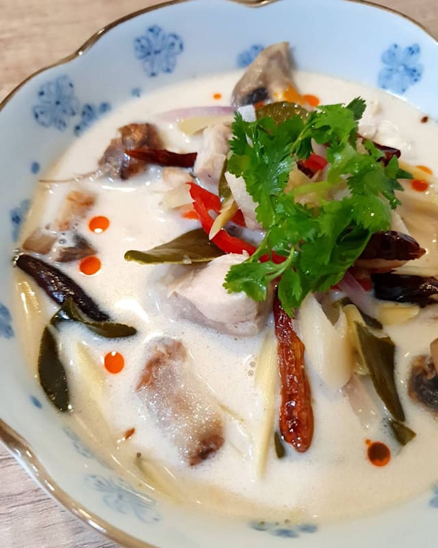 Un clásico de la cocina real thai, caldo suave de pollo con leche de coco, champiñones, galanga y zumo de limón.