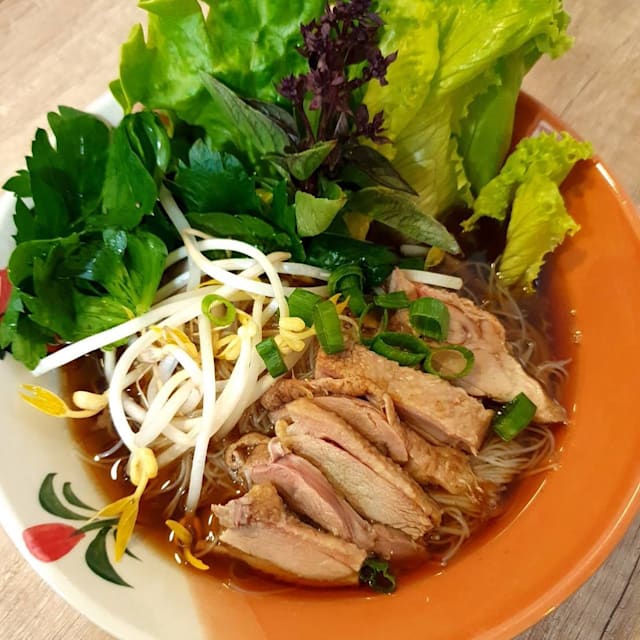 Rollitos de pasta fresca de arroz al vapor rellenos de verduras frescas y langostinos acompañados de salsa de especiada.