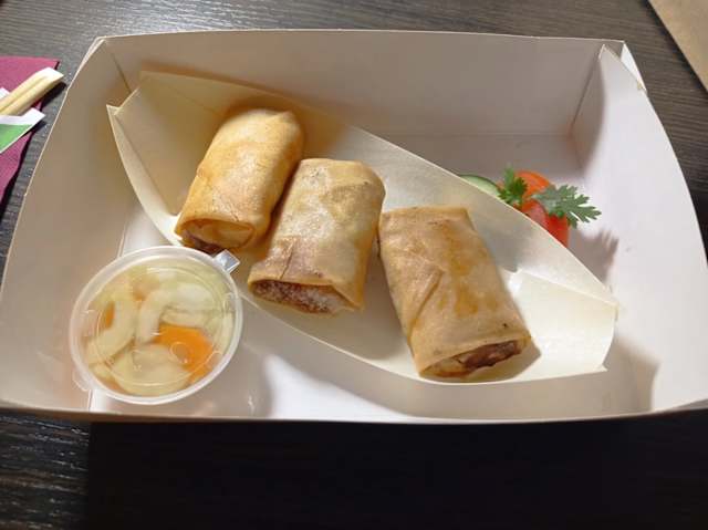 - Involtini fritti farciti con carote, germogli di soia e cavolo liscio, serviti con salsa d’arachidi