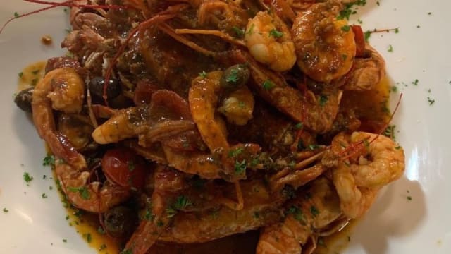 poca mozzarella, seppie, calamari, polipo, code di gambero, sedano e carote croccanti