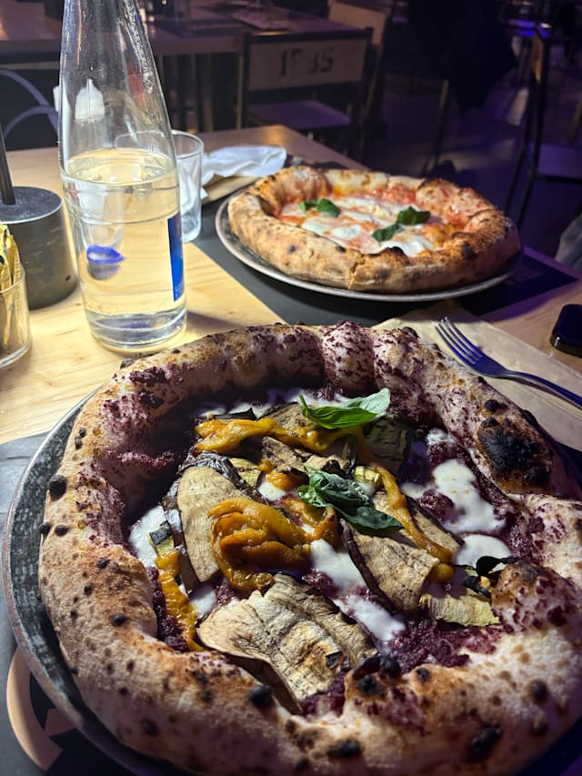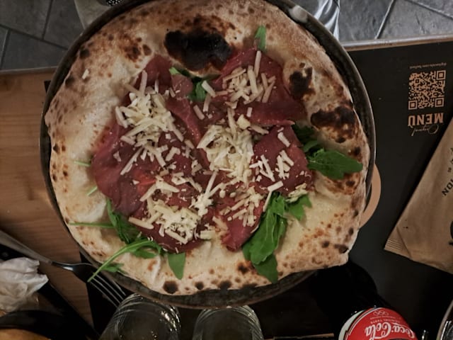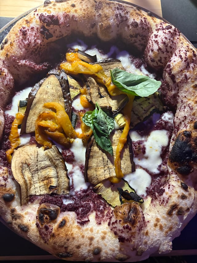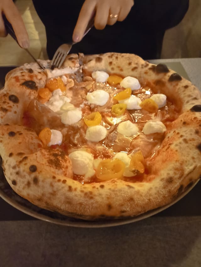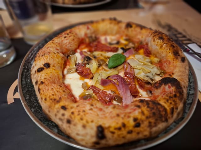 Base crema di carciofi, provola affumicata, guanciale, datterino rosso semi-dry del Piennolo, crumble di tarallo, basilico, olio evo