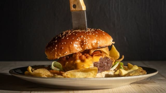 Homemade bun, hamburger Black Angus 200 gr, formaggio affumicato, valeriana, maionese all’aglio nero e noci e contorno di patatine fritte dippers “Lamb Weston”