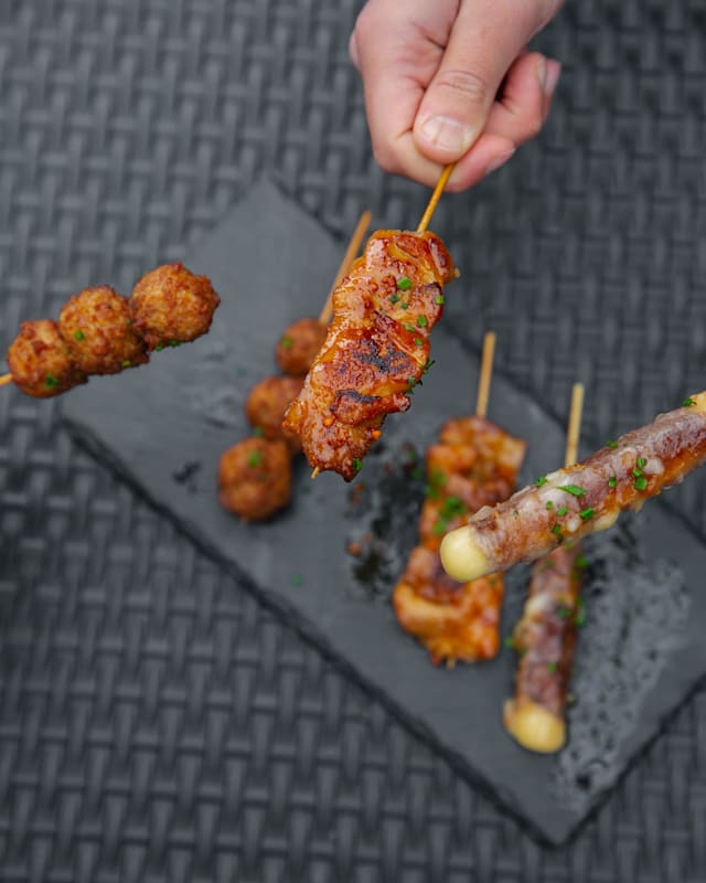 - X2 brochettes boeuf fromage, x2 brochettes boulette de poulet, 1 brochette thon, + 1 saumon)