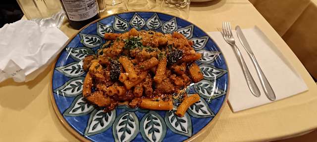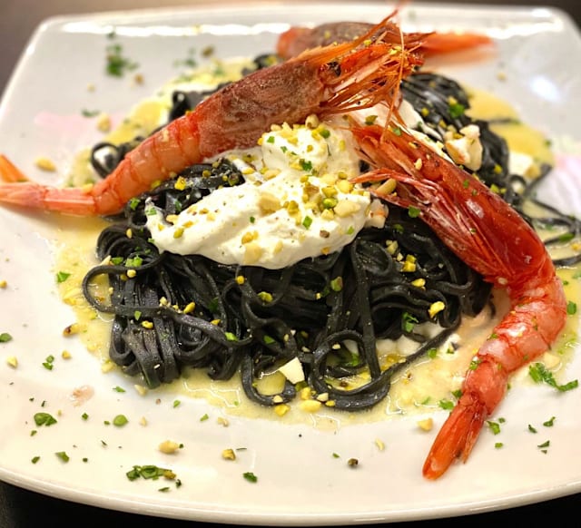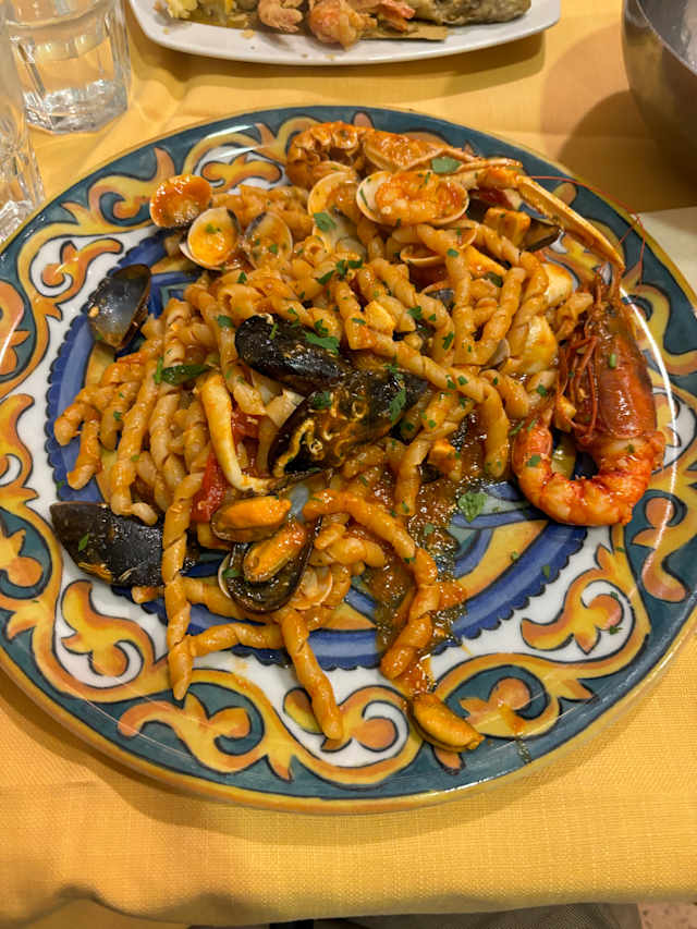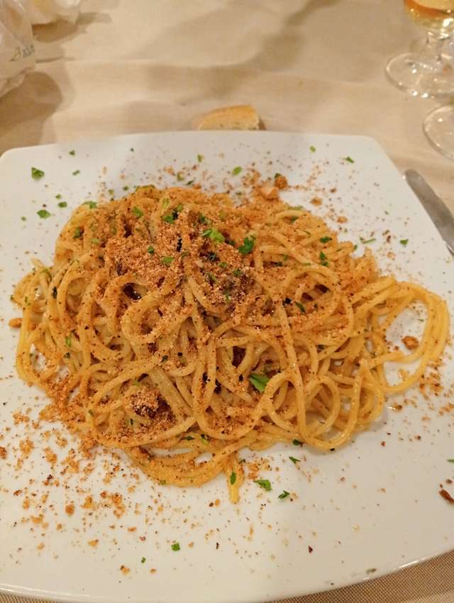 (fusillone con pesce spada, melanzane, uvetta, mandorle, menta, ricotta fresca e salata, pangrattato)