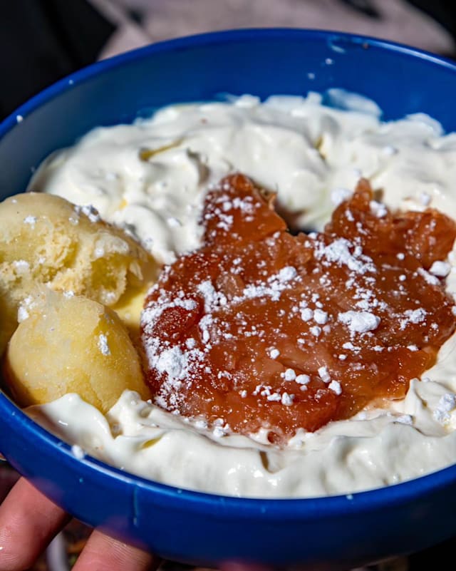 Accompagné d'une crème liquide, glace, chantilly, nappage chocolat ou caramel.