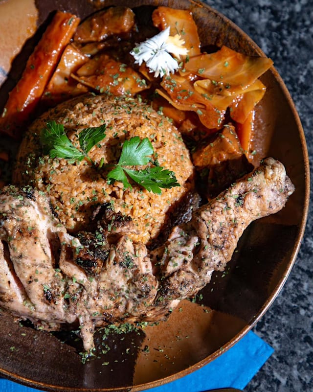 Le célèbre plat sénégalais. Riz parfumé cuit avec des légumes variés et une sauce tomate, un poulet braisé pour une harmonie de saveurs exquises. Un délice incontournable!