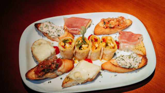 Prato para dois com fajitas, pão de alho com presunto, pão de alho com queijo, bruschetta de tomate e crostini de camarão.