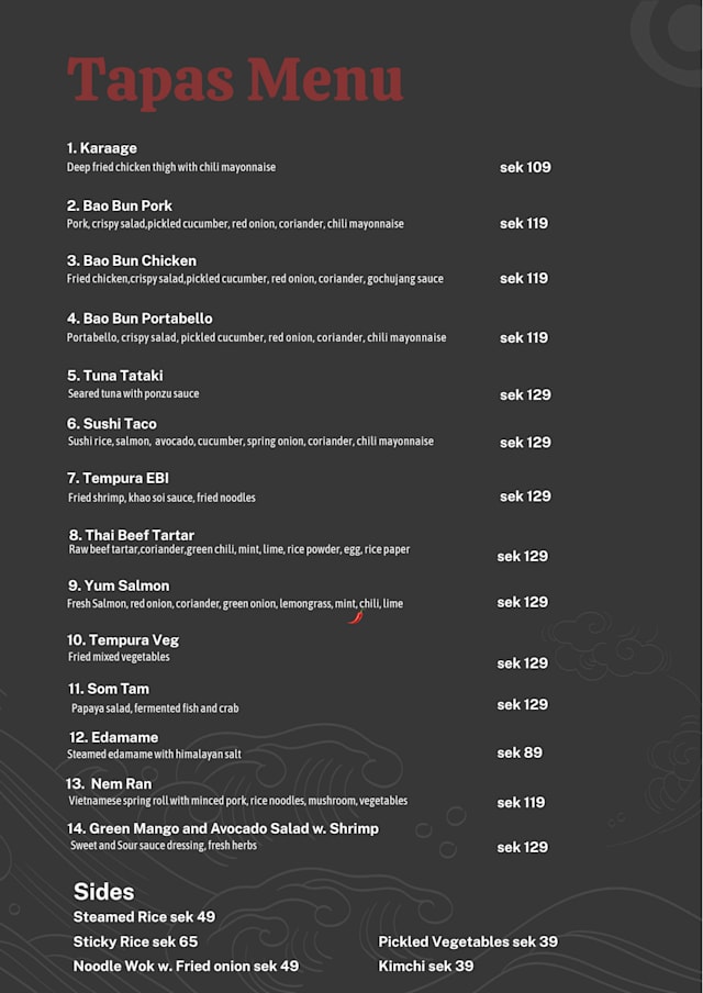 10/10We were a party of four and ordered 5 or 6 different tapas’ a total of 11 “items” from the menu. Amazing food with very various taste’s and we were all full when finishing up! Pr. 8 August ‘25, we dear to recommend all our ‘things’ 🤩 no. 1 (Fried chicken w/ chilimajo), 2 (Bao bun pork), 6 (Sushi Taco), 7 (tempura EBI) and 8 (Thai beef tartar)! Both waitresses did a fantastic job and made our evening 100% successful!