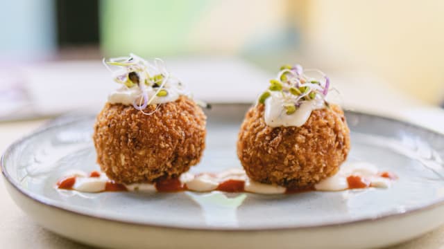 Croquetas con salsa de pimientos y aioli de chimichurri