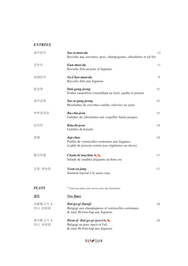 9.5/10Excellent choice on the menu, I’ve tried out quite a few Korean Restaurants in Paris and I found a lot of things that I had never eaten!