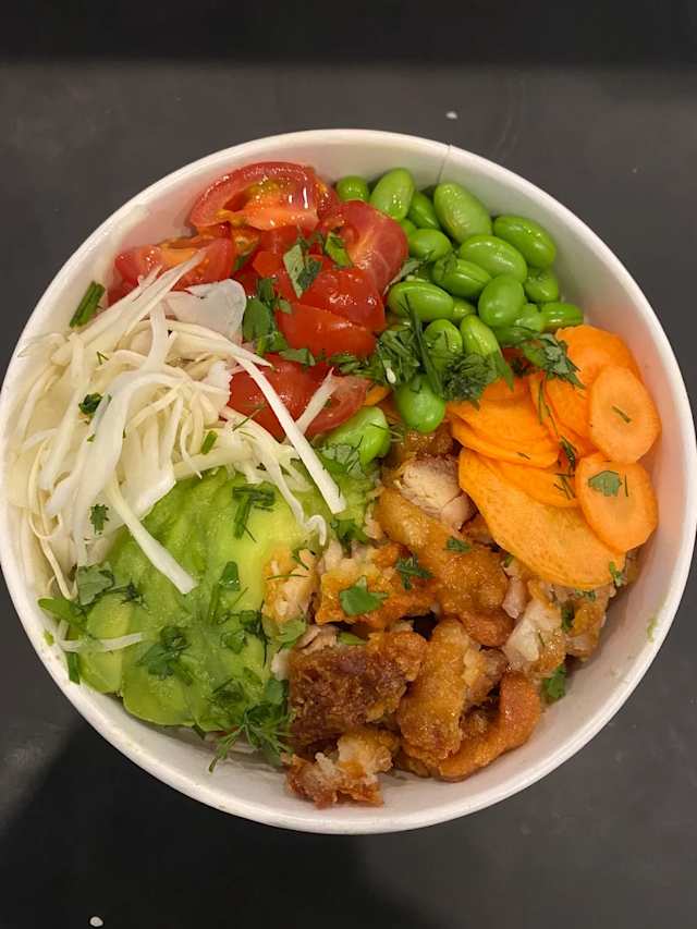 - Poulet tempura, avocat, tomate, sauce tonkatsu, oignons frits