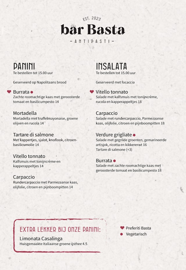 Stap binnen in onze urban Italian bar. Hier serveren we met veel liefde en creativiteit eerlijke en smaakvolle antipasti. En schenken we je mooie Italiaanse wijnen. Geniet aan de bar, op de knusse vide en op ons intieme terras in het gezelligste straatje van de stad.
