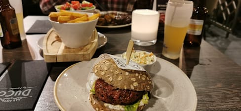5.5/10Food is ok, I tried their burgers: tasty and proposed also in unconventional variants. Nice atmosphere, big wooden tables and an enjoyable terrace for outside dining. Worst part of the story is service: Restaurant almost empty, 5 waiters in the room and nobody checking for my needs. Had to reach the bar twice to ask for napkins, waited 20 minutes for somebody to show up to ask for dessert, then I surrender and went for the bill. Pity.