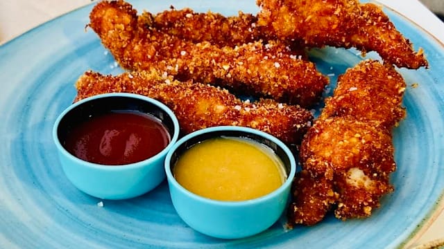 Rebozado con cereales y acompañado de dos salsas caseras: mostaza intensa con miel y barbacoa.