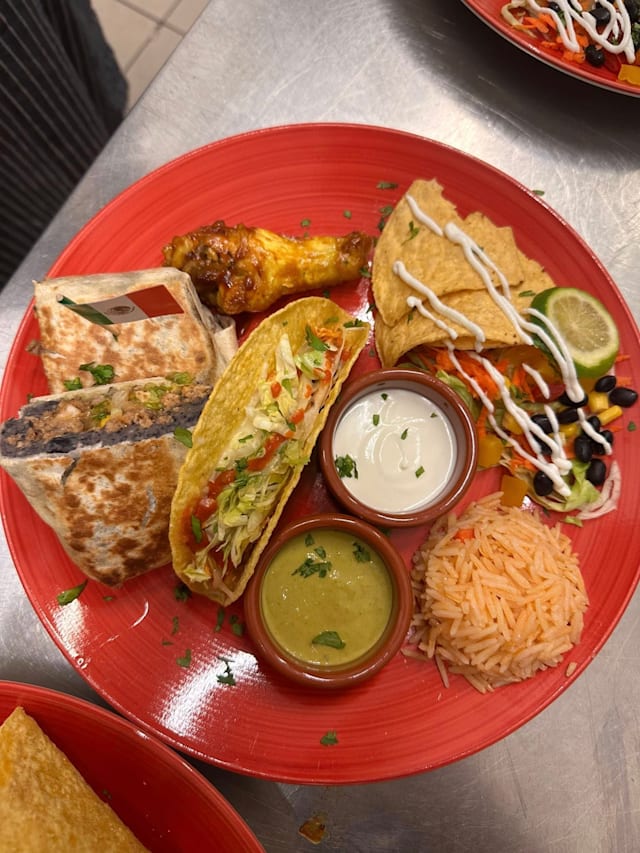 Tortilla di mais giallo servita con fagioli rossi, riso messicano e salsa. Di pollo / di carne / difagioli, formaggio, insalata salsa pomodoro, e panna acida (3 strati)