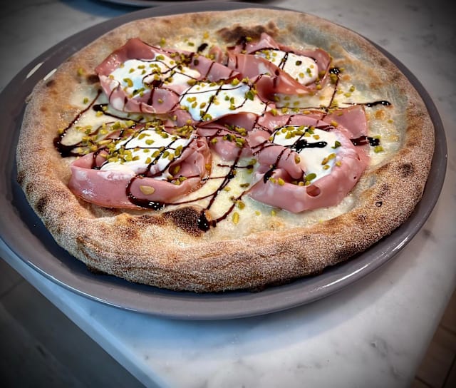 Mozzarella fior di latte, mortadella bologna, stracciatella, granella di pistacchio, glassa di aceto balsamico.