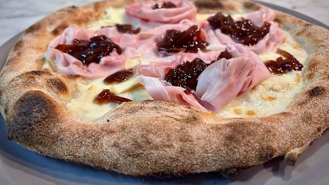 Mozzarella fior di latte, pomodoro, blu di bufala, ‘nduja di Spilinga, granella di nocciole tostate.
