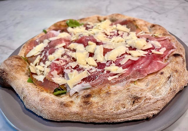 Mozzarella fior di latte, rucola, prosciutto crudo DOP, grana, pomodoro.