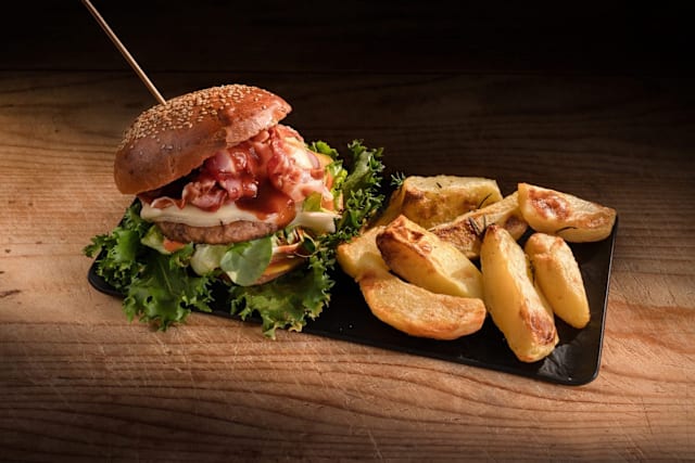 - Hamburger di manzo, edamer, bacon croccante, pomodori, cetrioli, cipolla rossa e misticanza con contorno a scelta fra: patate al forno - verdure grigliate - patate fritte