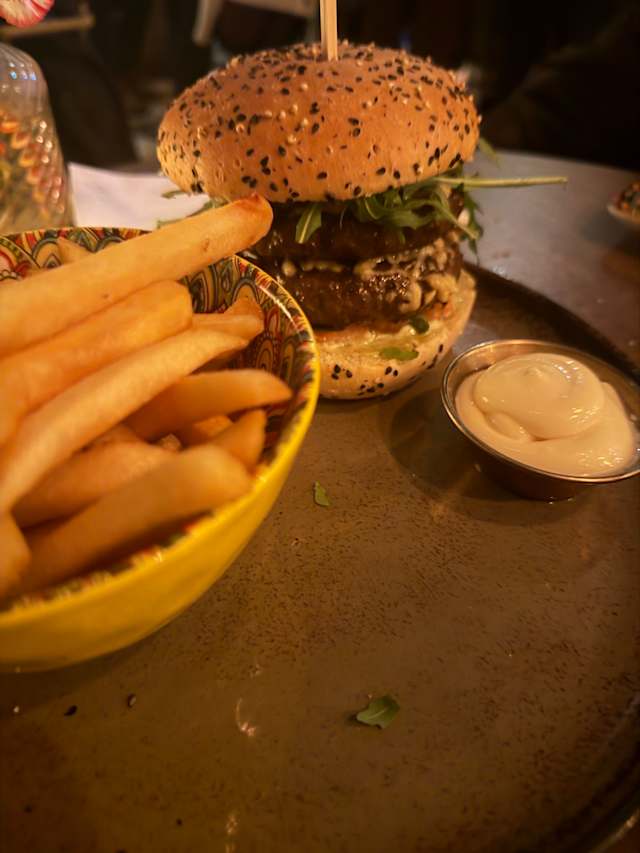 - Vegetarian burger • brioche bun • pomodoro • onion • pickles • cheddar • fries