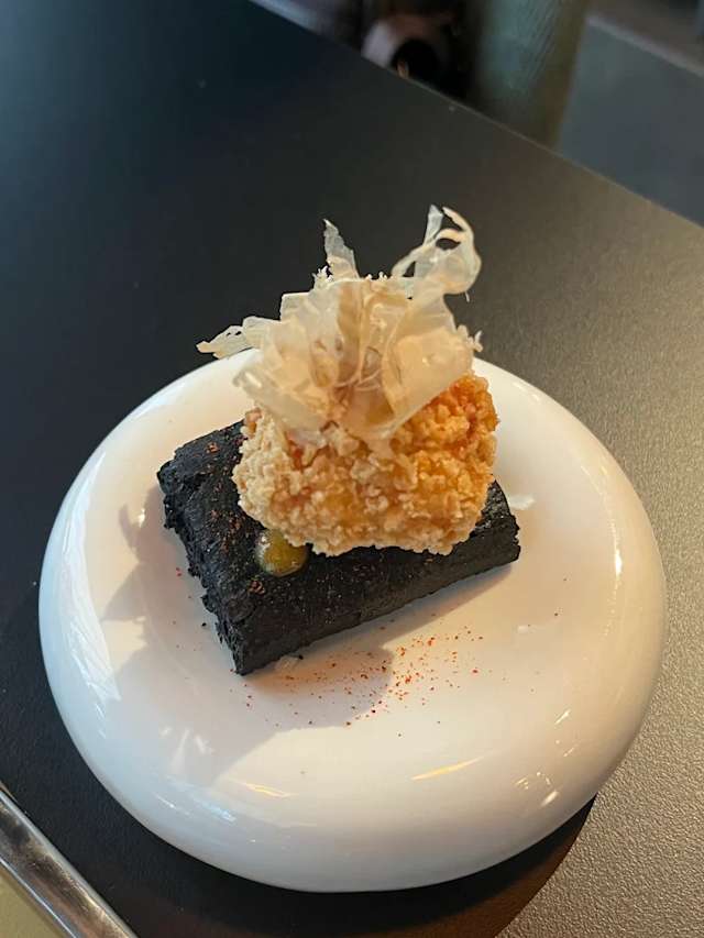 - Baccalà mantecato, chips di risotto alla milanese e nero di seppia, cavolo rosso in osmosi e gel di tropea.
