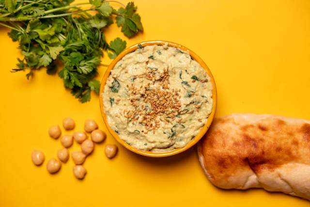 - Halloumi snacké, sauce blanche, aubergines rôties, oignons pickles, poivrons grillés, crudités