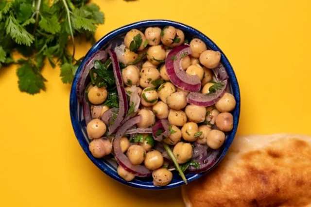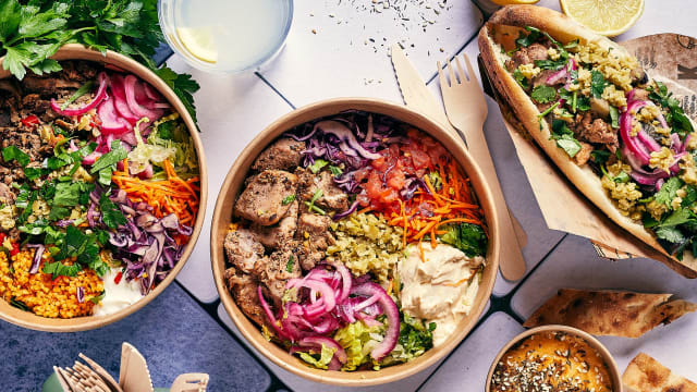 - Poulet marinade cumin/citron, sauce blanche, courgettes, oignons pickles, persil, feta, crudités