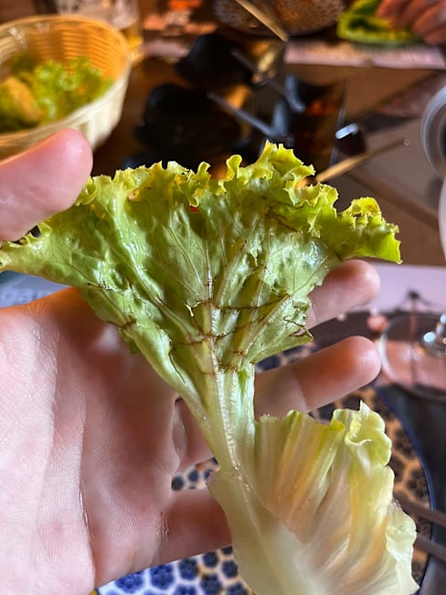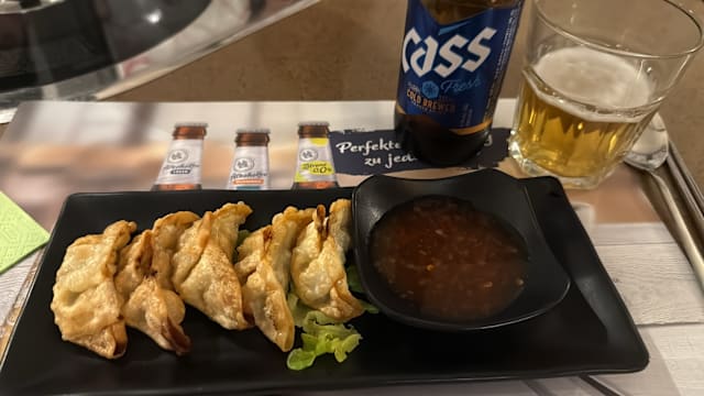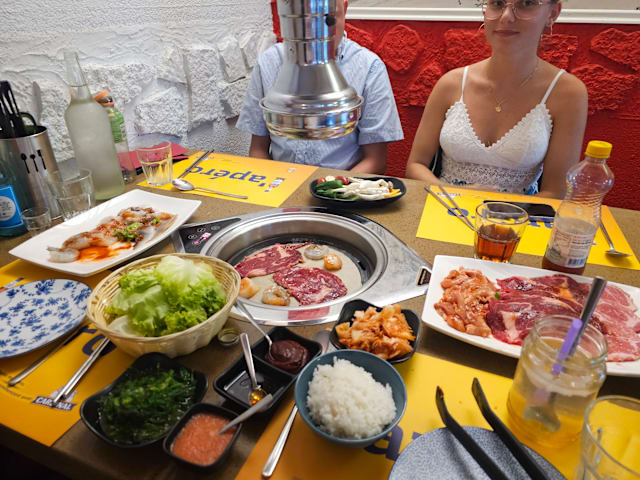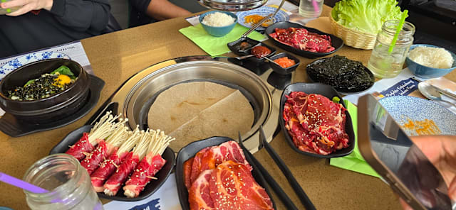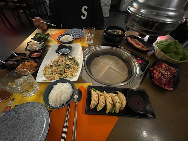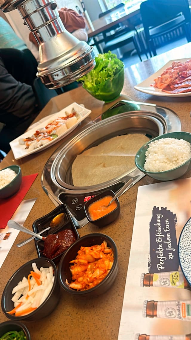 3.5/10This is far away from being a so called korean barbecue, an electric heating plate, covered with some baking paper, so the meat is not grilled, but is boiling in its proper juice. Some Kimchi with the quality of cole slaw, tasteless. No tasty leaves but cheap salad in a doubtful quality. The waitress was more occupied in smoking cigarettes than taking care of the customers The only good point was the quality of the meat, even if it was still half frozen when served.