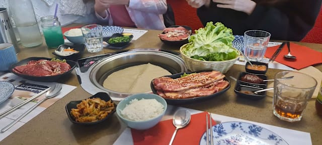 5/10I would expect more authenticity from a Korean BBQ restaurant. The rice is served uncovered, so it becomes cold very quickly. The kimchi was very sweet (chinese cabbage), not really to my taste but maybe just not was I'm used to, also we got wakame salad as one of the kimchi servings. There were not sauces per se, just sesame oil and gochujang paste (too thick to be used easily). The meat was fresh and tasted good. The salad leaves that were brought were soaking wet. The service is good but not particularly friendly.