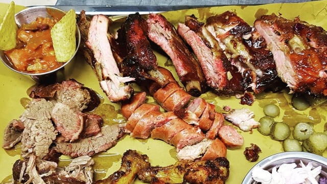 Degustazione di carni cotte al barbecue, salsiccia alla birra ,alette di pollo ,costatine di maiale ,pulled pork ,chili tex mex ,bacon ball,crispy chicken' insalata coleslaw e mais tostato
