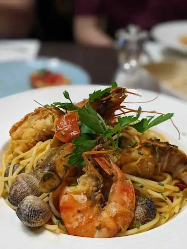 - Langoustine, gambas, vongoles, tomates concassées, vin blanc et herbes fraîches