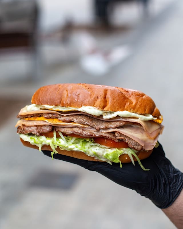 Carne de ternera, mayonesa de la casa, jamón york, queso, huevo a la plancha, tomate y lechuga. (puede pedirse de pollo o vegetariano)