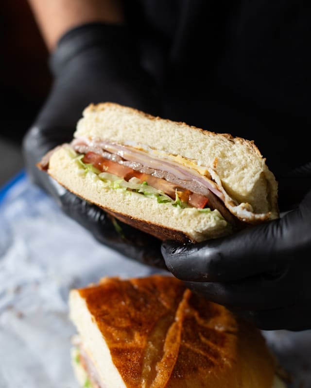 Carne de ternera, mayonesa de la casa, queso, pimientos y cebolla a la plancha, guacamole y un toque de salsa picante. (puede pedirse de vegetariano)