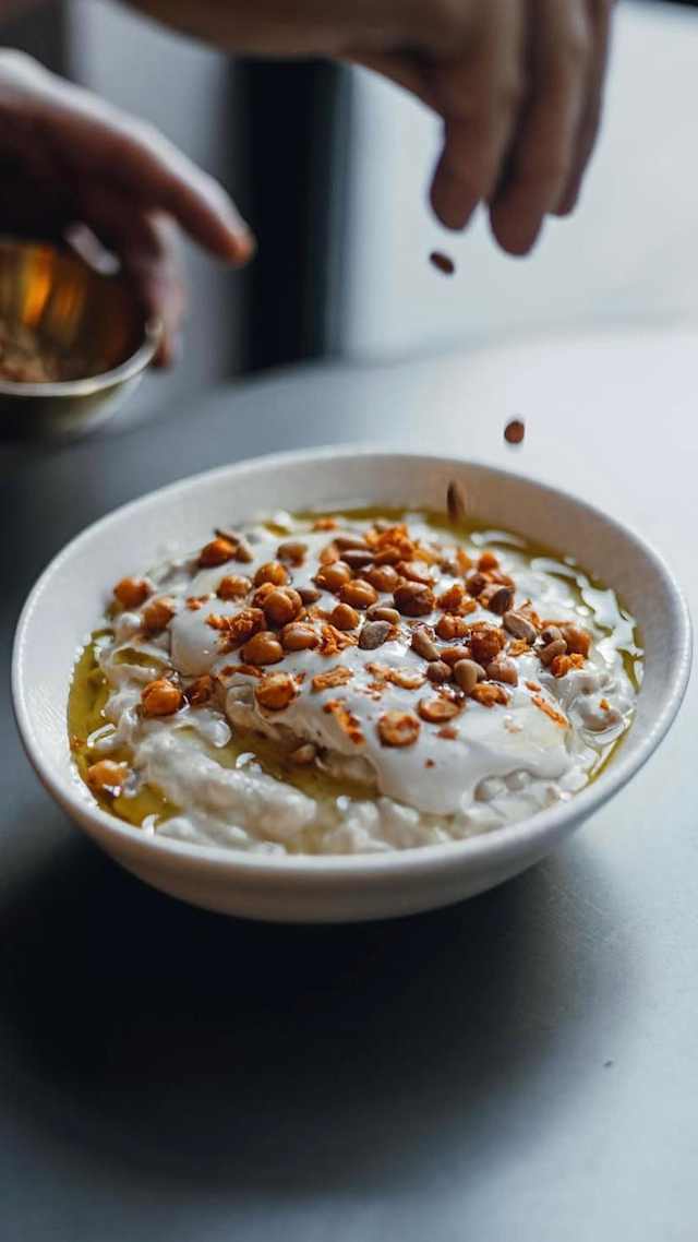 - Tortellini artesanal relleno de labneh, espinacas y ajo confitado, presentado en salsa de yogur caliente con aceite picante y piñones tostados.