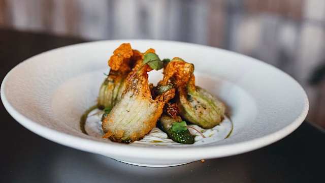 - Flor de calabacín rellena de arroz, calabacín, mozzarella y hierbas, servida con salsa de yogur con menta seca y sjug verde.