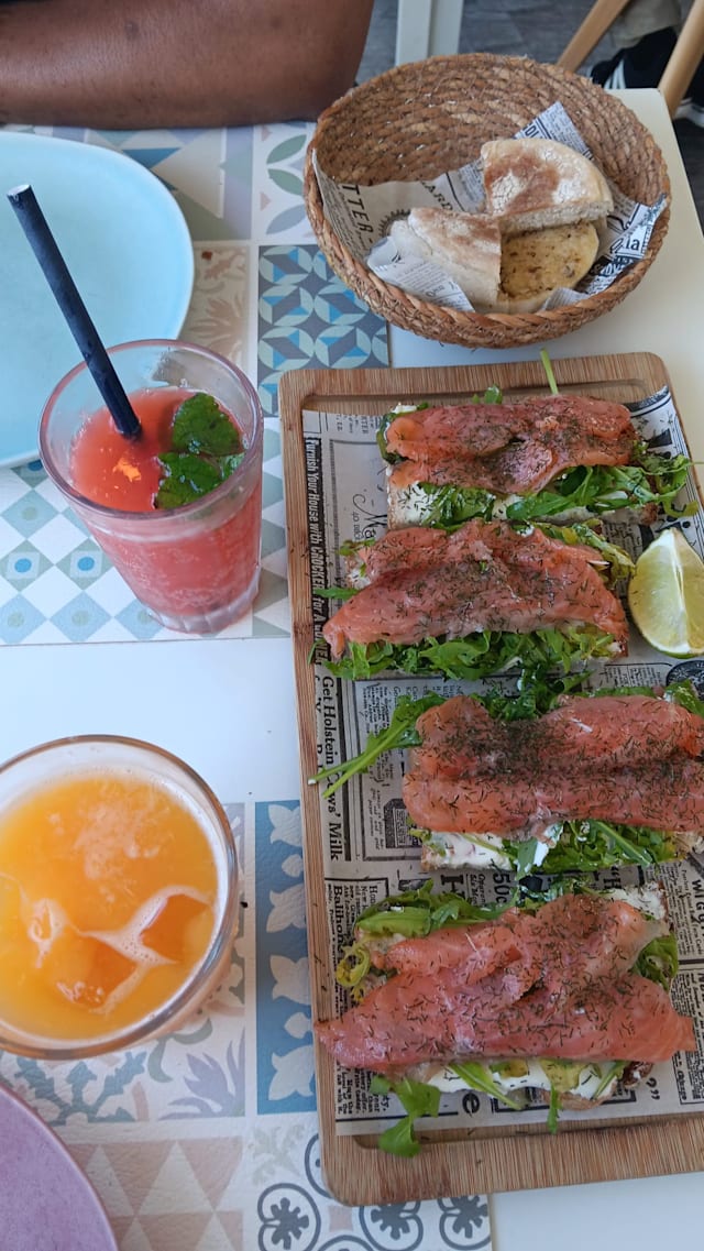 Pão saloio torrado, o nosso salmão curado, queijo creme, rúcula e lima