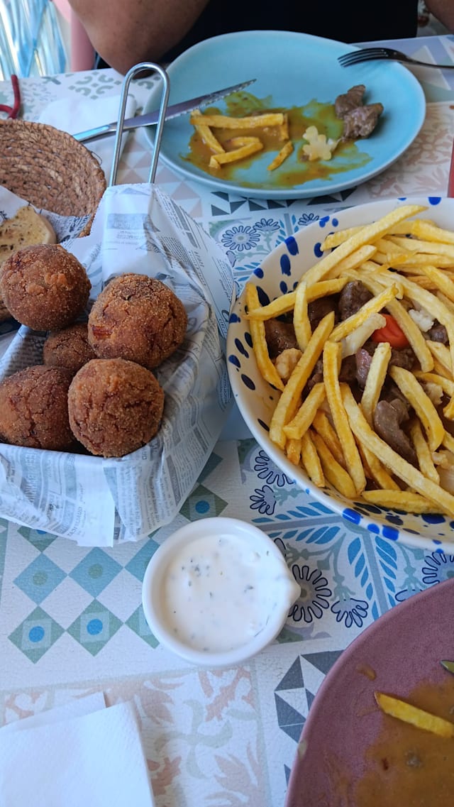 Bolo do caco, bife de atum, manteiga de alho, batata frita